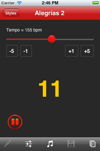 - Tempo. Esta sección te permite seleccionar la velocidad (tempo) a la que se reproduce el estilo cargado. El tempo se muestra en unidades bpm (beats per minute). Para cambiar el tempo puedes utilizar la barra de deslizamiento, o para incrementos pequeños de 1 o 5 bpm puedes utilizar alguno de los cuatro botones debajo de la barra de deslizamiento.